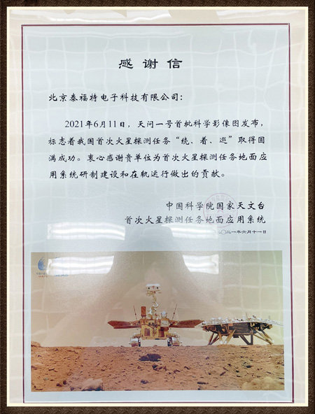 2021年6月11日,天問一號首批科學(xué)影像圖發(fā)布,標志著我國***火星探測任務(wù)“繞、著、巡”取得圓滿成功。衷心感謝貴單位為***火星探測任務(wù)地面應(yīng)用系統(tǒng)研制建設(shè)和在軌運行做出的貢獻!