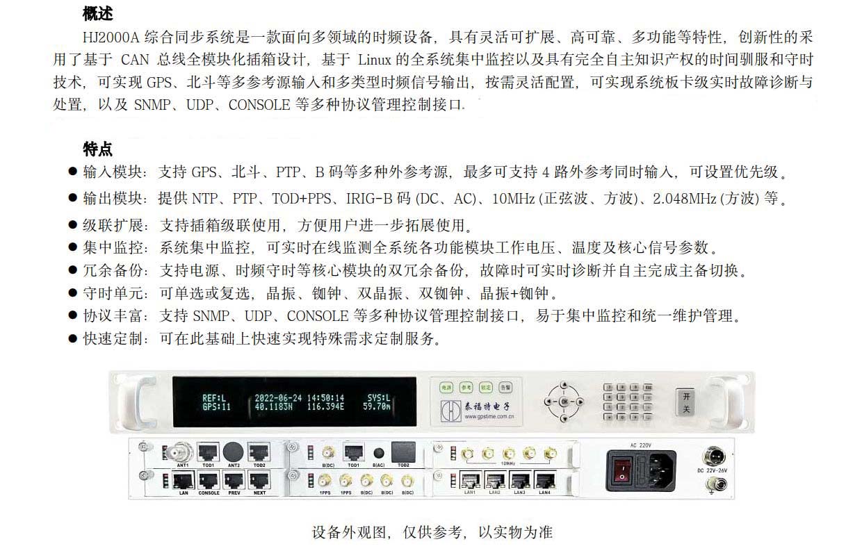 HJ2000A 綜合同步系統(tǒng)是一款面向多領(lǐng)域的時頻設(shè)備,具有靈活可擴展、高可靠、多功能等特性,創(chuàng)新性的采用了基于CAN總線全模塊化插箱設(shè)計,基于Linux 的全系統(tǒng)集中監(jiān)控以及具有完全自主知識產(chǎn)權(quán)的時間馴服和守時技術(shù),可實現(xiàn) GPS、北斗等多參考源輸入和多類型時頻信號輸出,按需靈活配置,可實現(xiàn)系統(tǒng)板卡級實時故障診斷與處置,以及 SNMP、UDP、CONSOLE 等多種協(xié)議管理控制接口,可廣泛應用于...